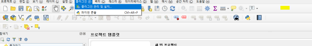 qgis실행 후 플러그인 메뉴를 선택
